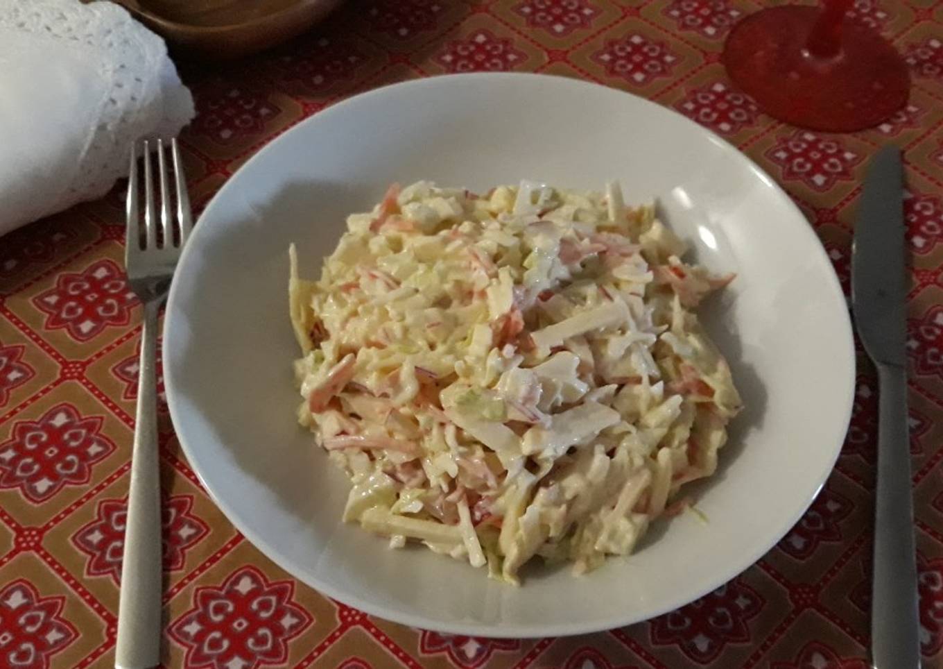 🥕🌱🍎¿Qué cenamos esta noche? Cuantas veces nos hacemos esa pregunta, pero si es verano, solo apetecen ensaladas, pero eso sí, siempre huyendo de la aburrida ensalada mixta. Por eso e inspirada por Los Juegos de Cookpad he hecho esta típica ensalada americana, la que sirven acompañando la comida rápida. Aunque la receta original lleva un aliño de mahonesa, cebolla, mostaza y crema agria, nosotros la hemos aliñado solo con mahonesa.