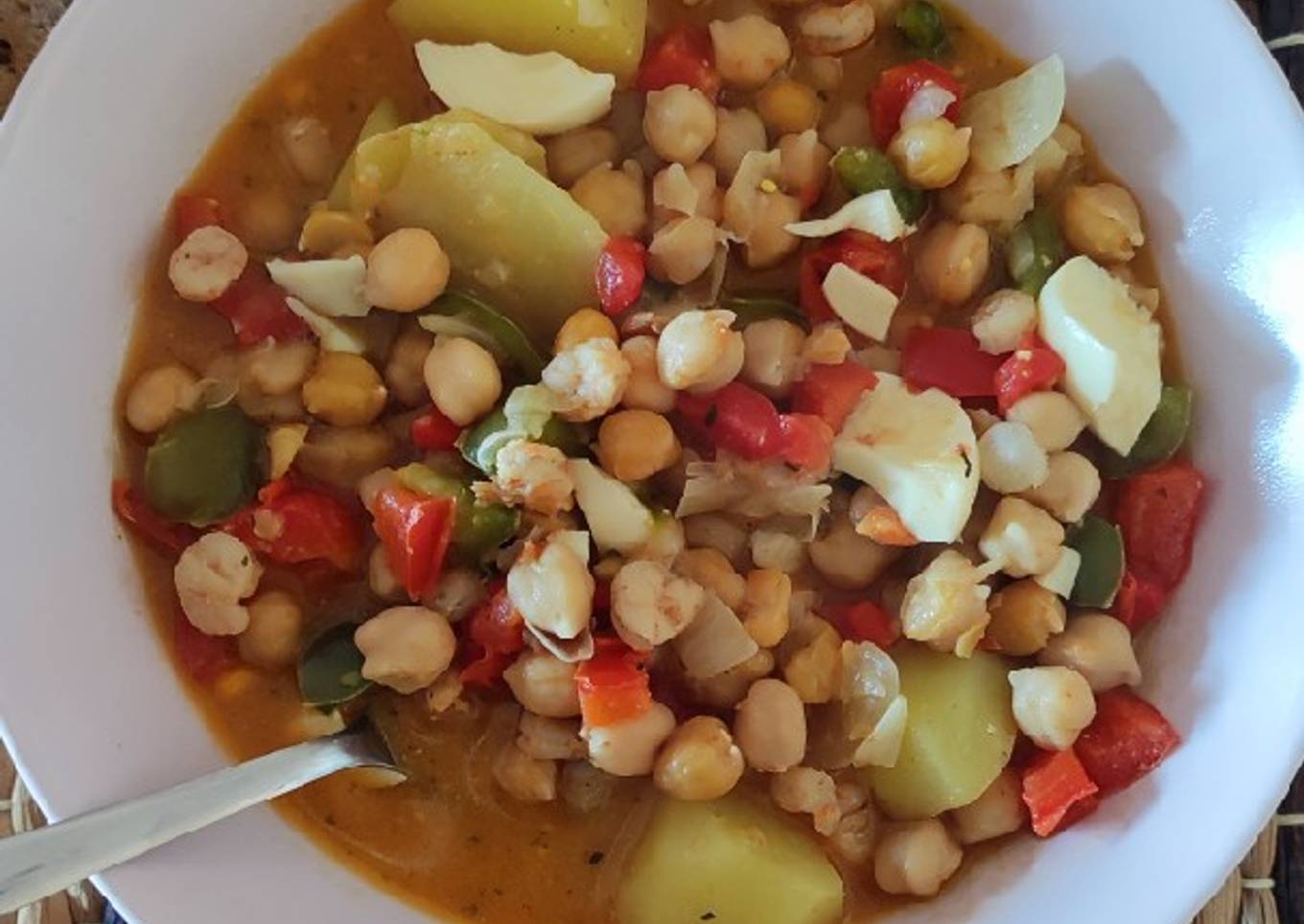 Garbanzos con gambitas y huevo duro