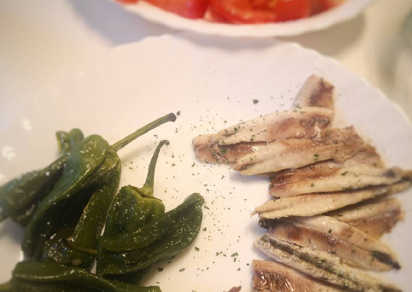 Boquerones al horno con pimientos de Padrón