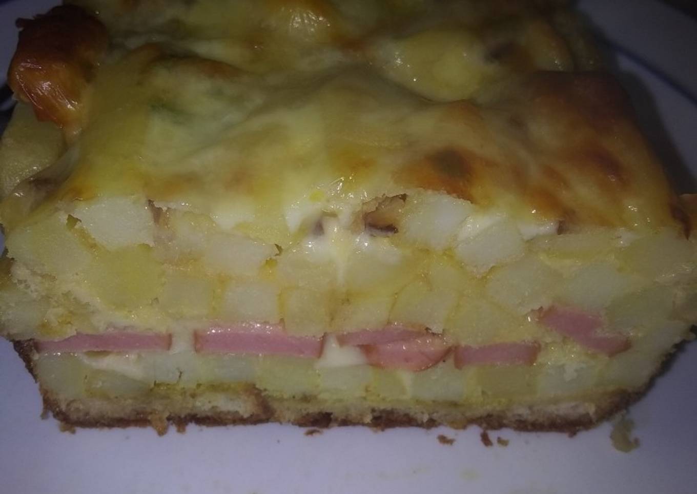 - Armo una capa de papas sobre las rodajas de pan, pongo un poco del huevo batido, pongo las fetas de jamón y 4 de las fetas de queso. Armo la otra capa de papas, pongo el resto del huevo, y para terminar pongo las 2 fetas de queso que quedaron. Llevo al horno 20 minutos más o menos