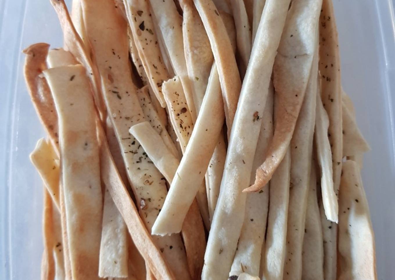 - Luego estirar bien fina la masa. Colocar los condimentos que quieras. Cortar en tiras. Cocinar en horno fuerte hasta que estén doraditas.