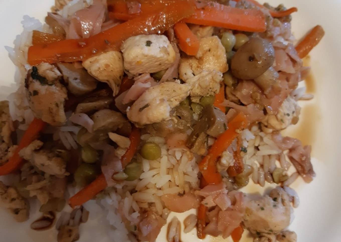 - Colar el arroz, agregarle un poquito de aceite y revolver. Emplatar el arroz abajo y nuestro salteado "chino" por arriba. Para terminarlo agregarle un poquito de soja y listo! A disfrutarlo!