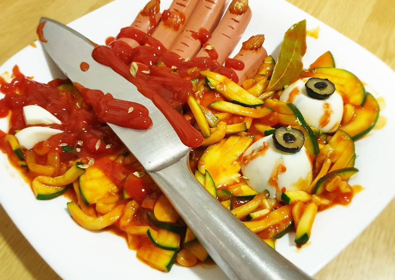 - Coloque las salchichas en forma de mano en el plato y modele los nudillos con un cuchillo y el huevo para las uñas y puse las almendras repasando los bordes de las uñas con tomate frito
