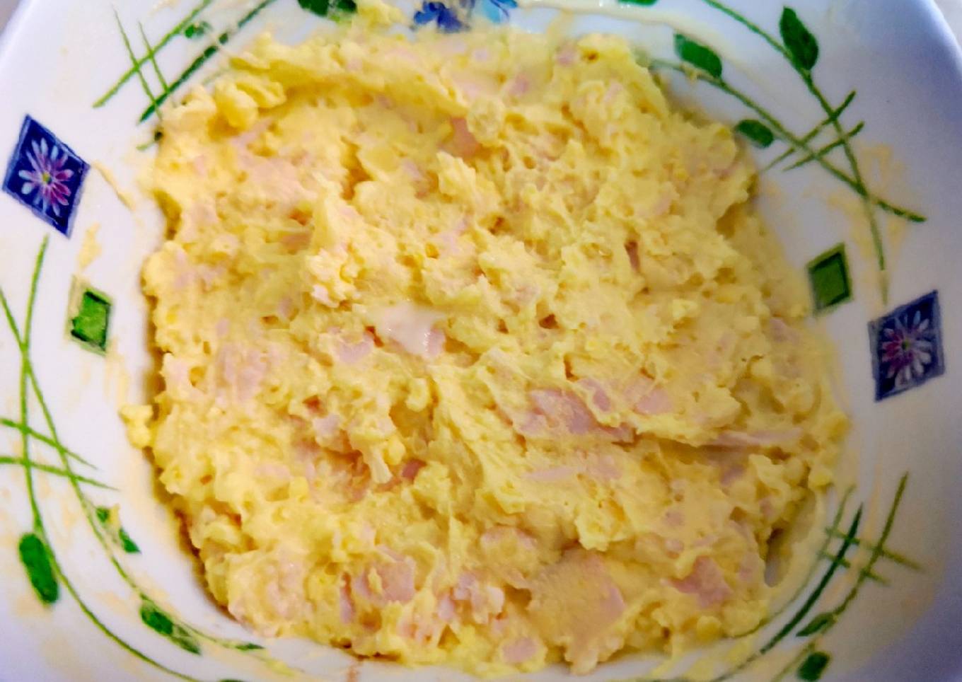 - Picar la lámina de jamón en cuadritos chiquitos, agregarlos a la mezcla, seguir moviendo.