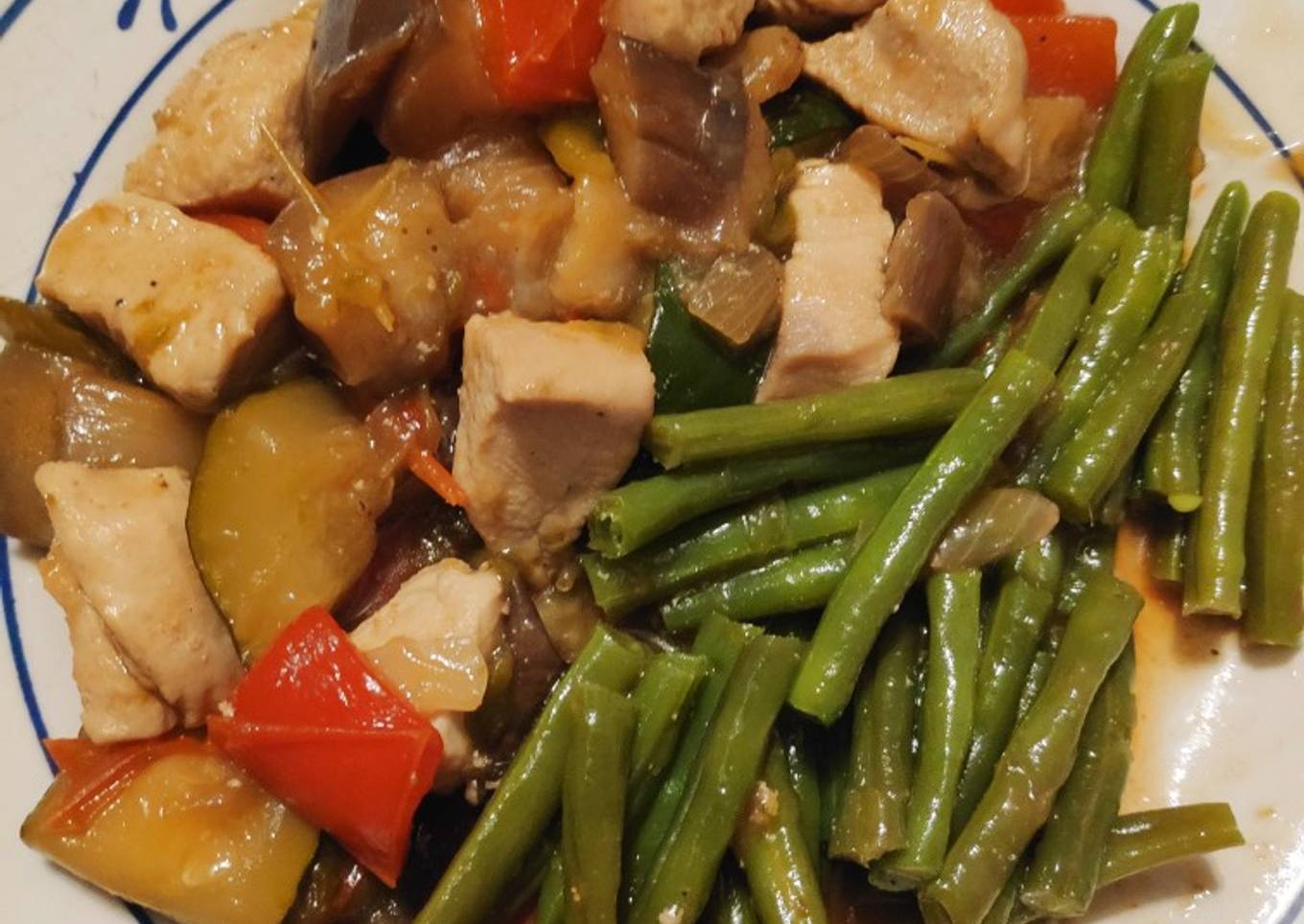 - Se puede servir solo o con un acompañamiento como en mi caso lo son las judías, a las que he añadido un poco de la salsa de la sartén.