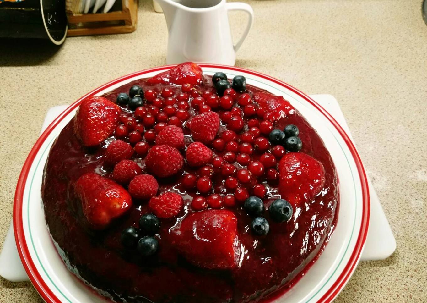 - Trituramos la mezcla en la batidora para que quede más fina y dejamos enfriar. Bañamos la tarta con la coulis de frutos rojos y decoramos con las frutas reservadas con una brocha de cocina. Pintamos las frutas con un poco de la salsita para que les dé más brillo, la metéis al frigo hasta el momento de servir y nada a disfrutarla!! (Ah se me olvidaba si os sobra salsita la podéis poner en una salsera algún goloso se echará más por encima de la tarta, no falla jejeje 😉)