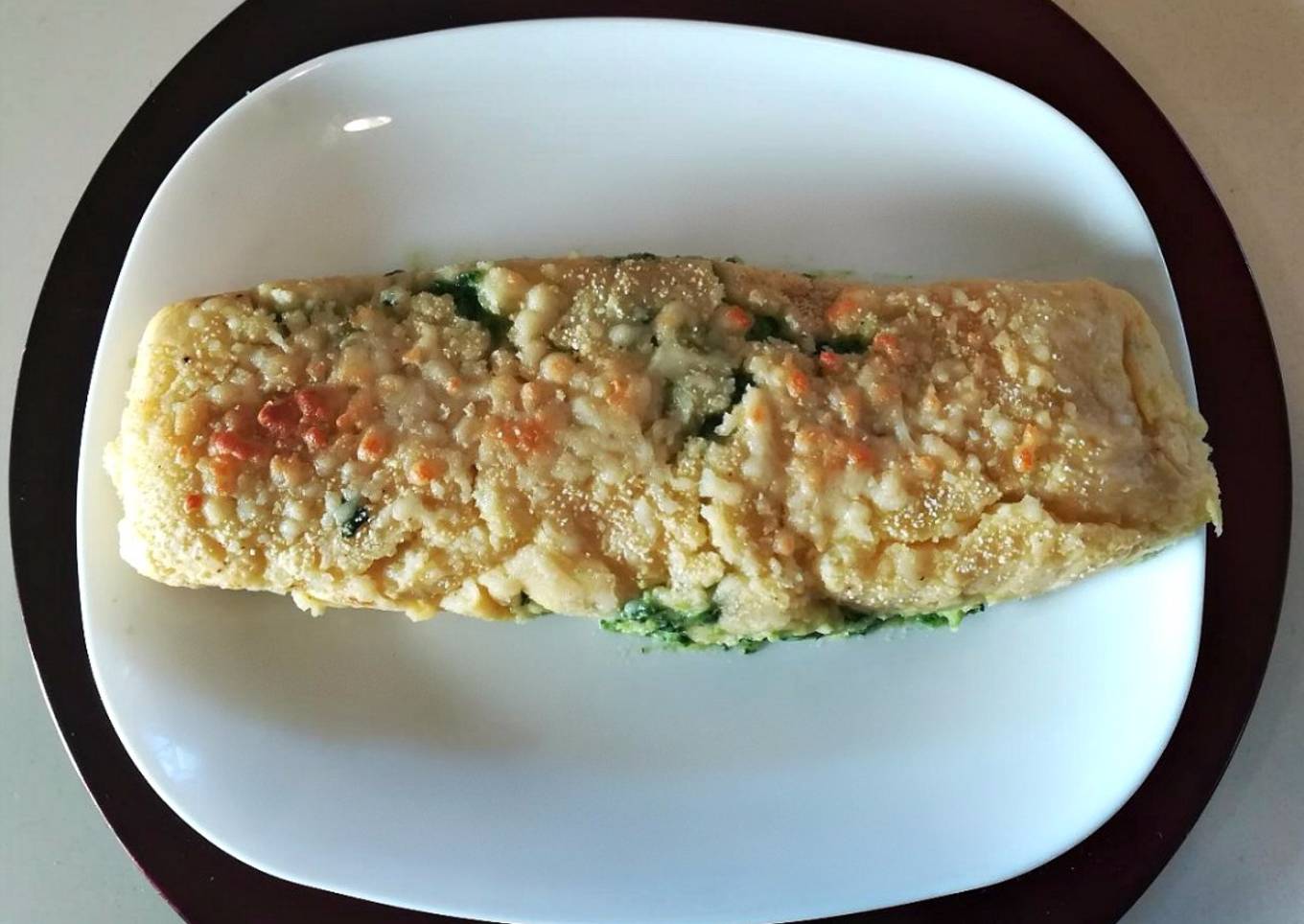 - Machacamos las patatas con el huevo, pimienta y (leche si quedase muy espeso, este, no lleva) Enrollamos con cuidado, espolvoreamos con el queso y pan rallados, echamos un chorrito de aceite por encima y horneamos/grill