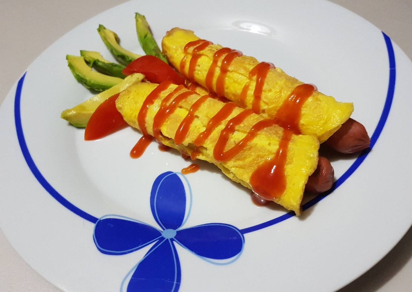 - Batir el huevo y vaciar en el sartén cubriendo todo el fondo, cuando se pueda despegar solito dar vuelta, colocar la salchicha y envolverla con la tortilla de huevo.