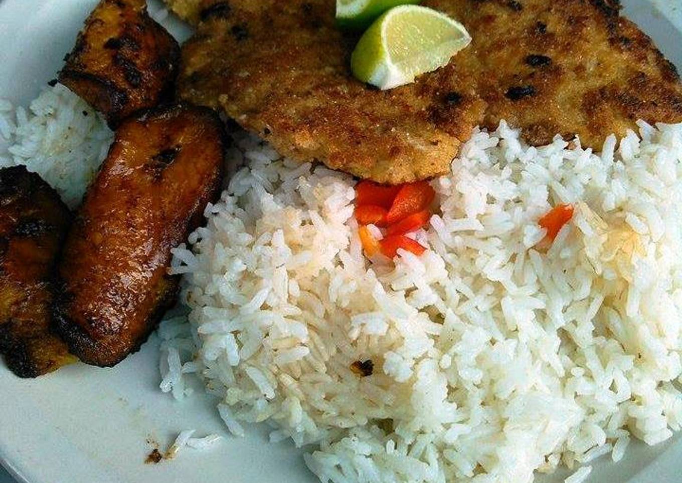 - En esta ocasión lo serví con arroz blanco simple pero rico y plátanos machos fritos, una de mis frutas favoritas y de consumo casi diario.